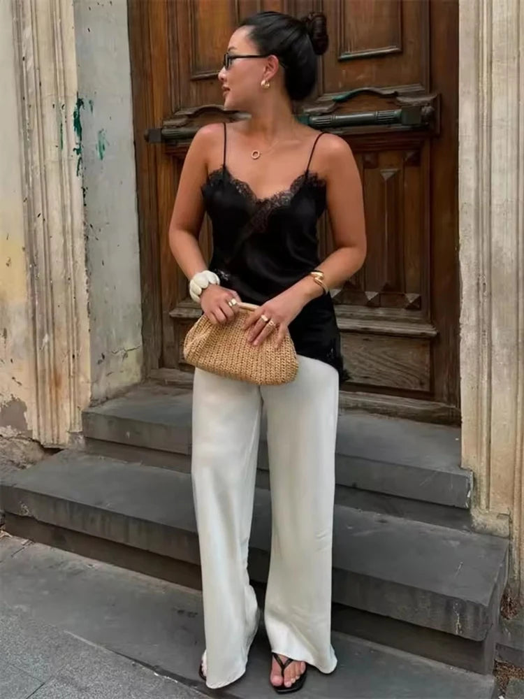 Crop top with spaghetti straps and hollow-out details in a patchwork design. The slim-fit silhouette hugs the body, creating a sexy and elegant look, perfect for summer evening outings, parties, or clubwear.